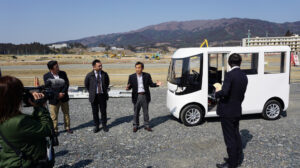 3月20日、東日本大震災から復興再建中の陸前高田市で開催された「『移動のユニバーサルデザイン』を考えるシンポジウムに参加しました。SBXに試乗した参加者からは「ステップが低くて乗り降りしやすい」「静かで乗り心地が良い」「室内で会話がはずんで楽しい」等、大変好評でした。また、関係者からは復興のシンボルとして陸前高田市から発信したい、との要望がありました。